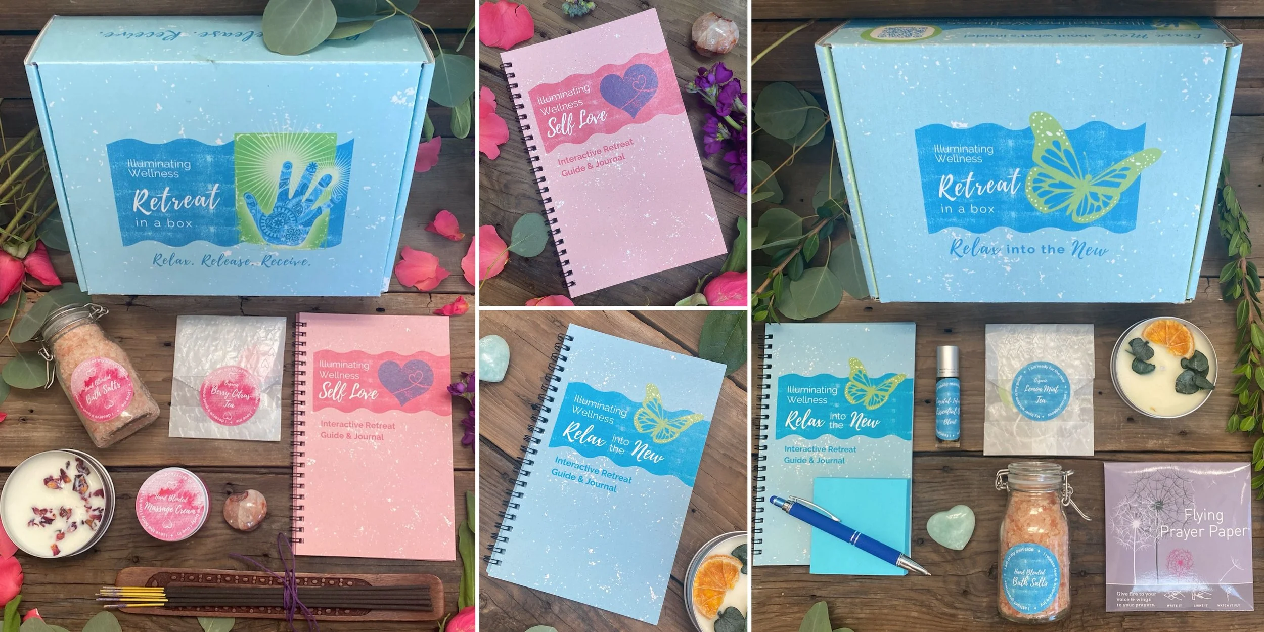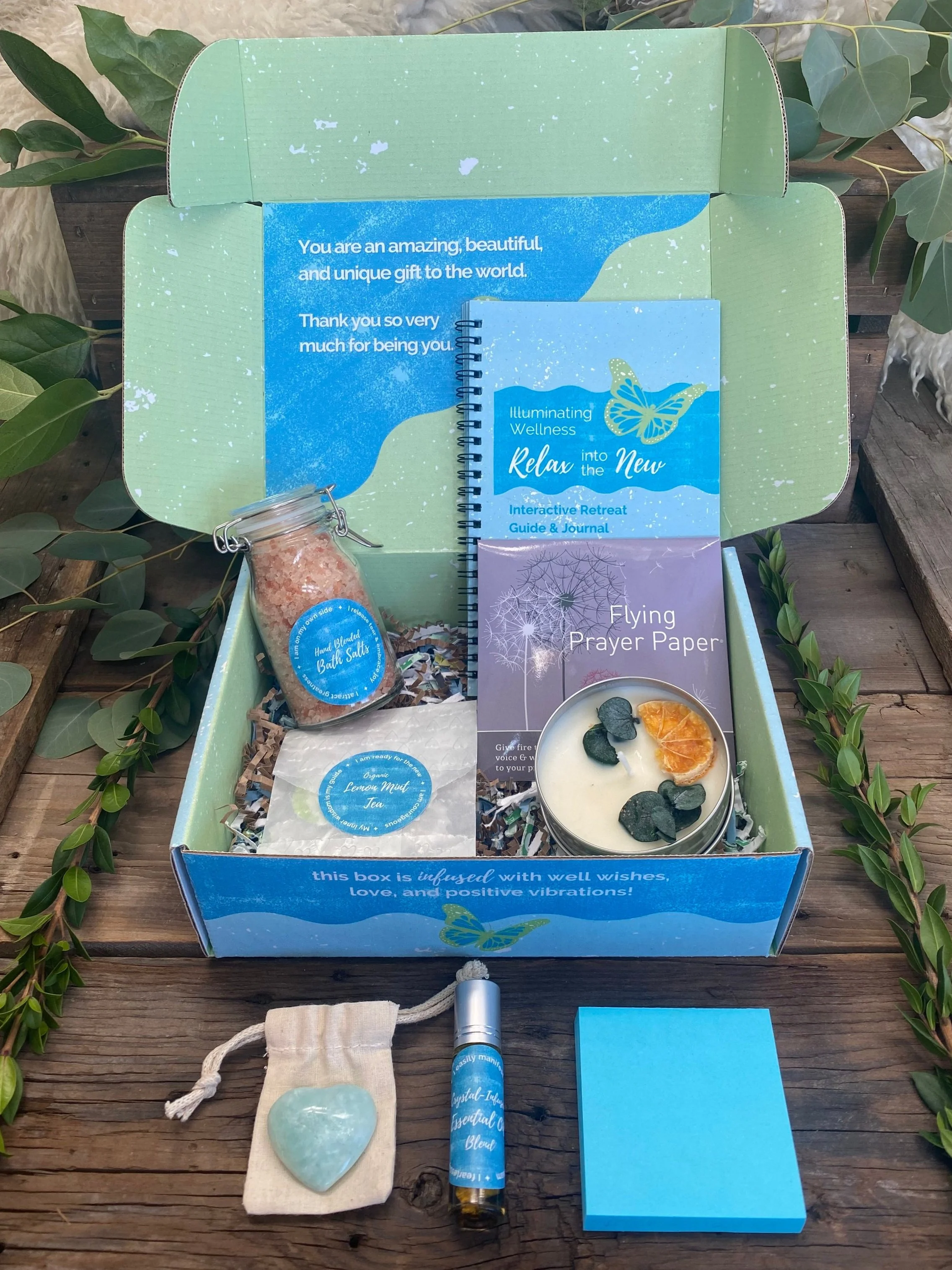 This retreat box includes three separate digital downloads of guided retreat activities such as Tapping In Joy (similar to the Emotional Freedom Technique), Meditations, and a Guided Massage Meditation. The box includes a guided journal with prompts, wellness tips, inspiration, and nourishing recipes along with retreat goodies such as hand-blended massage cream, bath salts, a hand-poured rose beeswax candle, organic citrus berry teas, a heart-shaped hematoid gemstone, hand-dipped incense sticks, wooden incense holder and beyond to support your retreat experience!